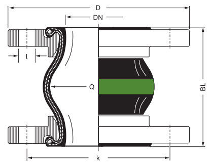 Elaflex ERV - GR GREEN BAND 绿色带环系列膨胀节,用于酸、碱、化工介质和腐蚀性化工废水。温度范围-20°C 至 100°C,短时间使用可达 110°C,用于含油的压缩空气温度可达 90°C,内衬海帕伦CSM。
